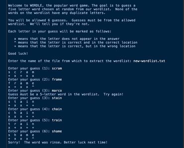 This program implements a version of the popular game "Wordle". It asks the users to input a file name from where to extract words, and creates a wordlist. The program reads the text files and only extracts word with 5 letters. Additionally, it only extracts words with no duplicate letters. If an "answer" is provided it will use that as the the correct answer otherwise it picks a random word from wordlist. It then allows user to guess six times. Guesses must be from the allowed wordlist and the program will tell you if they're not. After guessing, the program will tell the user if a letter doesn't appears in the word, if a letter is correct and in the correct place, and if a letter is correct but in the wrong place.